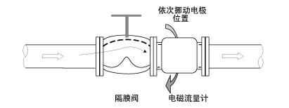 即使平時將隔膜閥完全打開使用,也會由于流速分布不均使電磁流量計產(chǎn)生幾個百分點的誤差。把電磁流量計安裝至閥門的上游可以解決問題,但是由于過程運行上不允許這樣做,所以利用電磁流量計的安裝螺孔,依次挪動電極位置,找到一個可以獲得最接近理論流量值的位置(如下圖),便解決了問題。